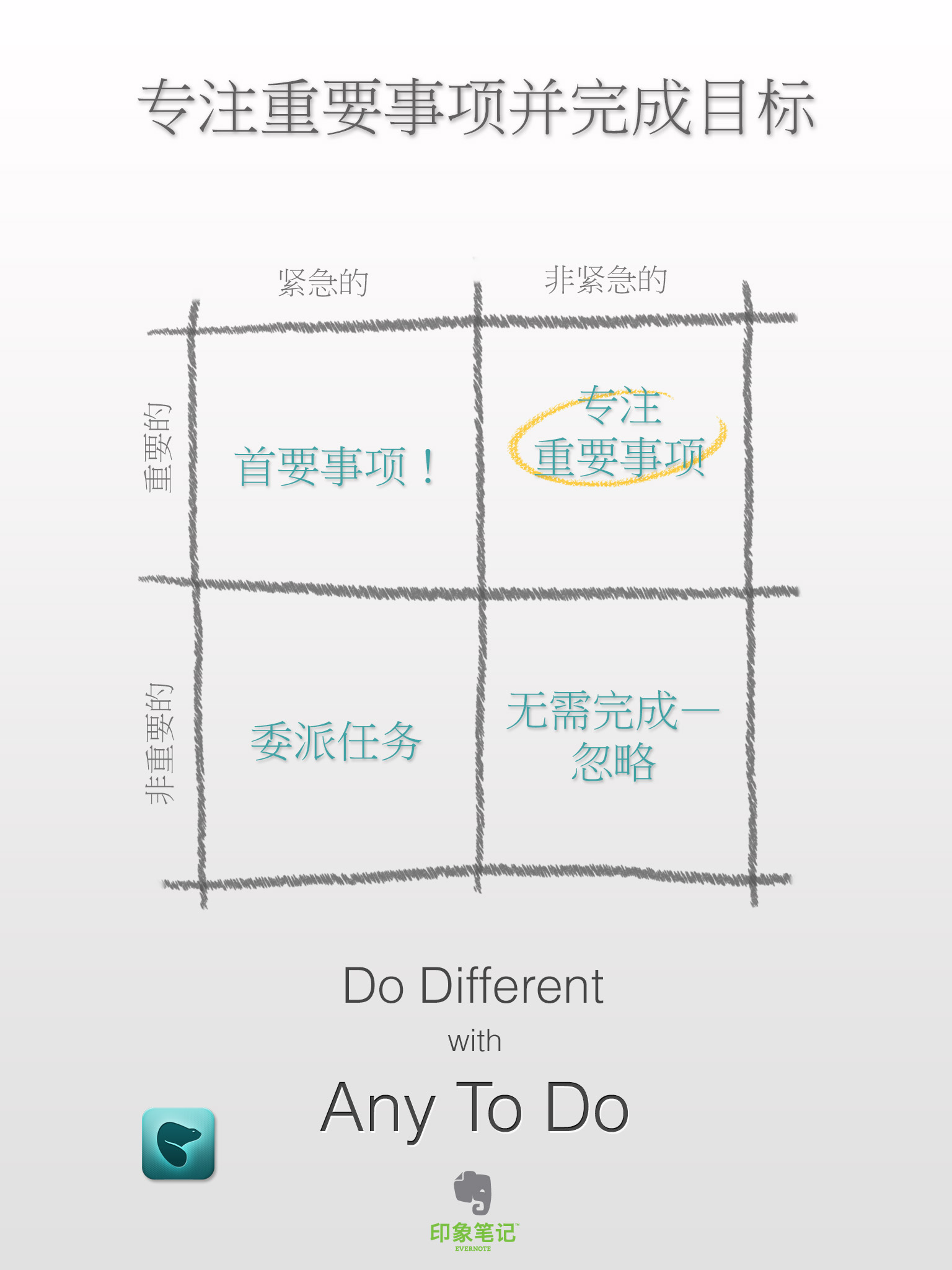 使用Any To Do,专注于重要事项,根据To-Dos的紧急性和重要性来对其进行优先处理,让你可以有效的管理时间,并完成你的目标。
