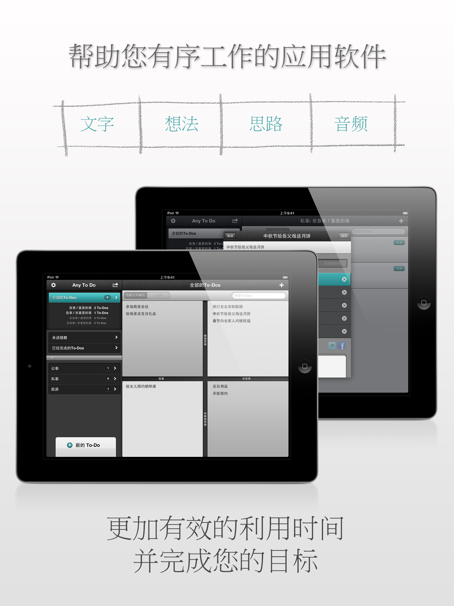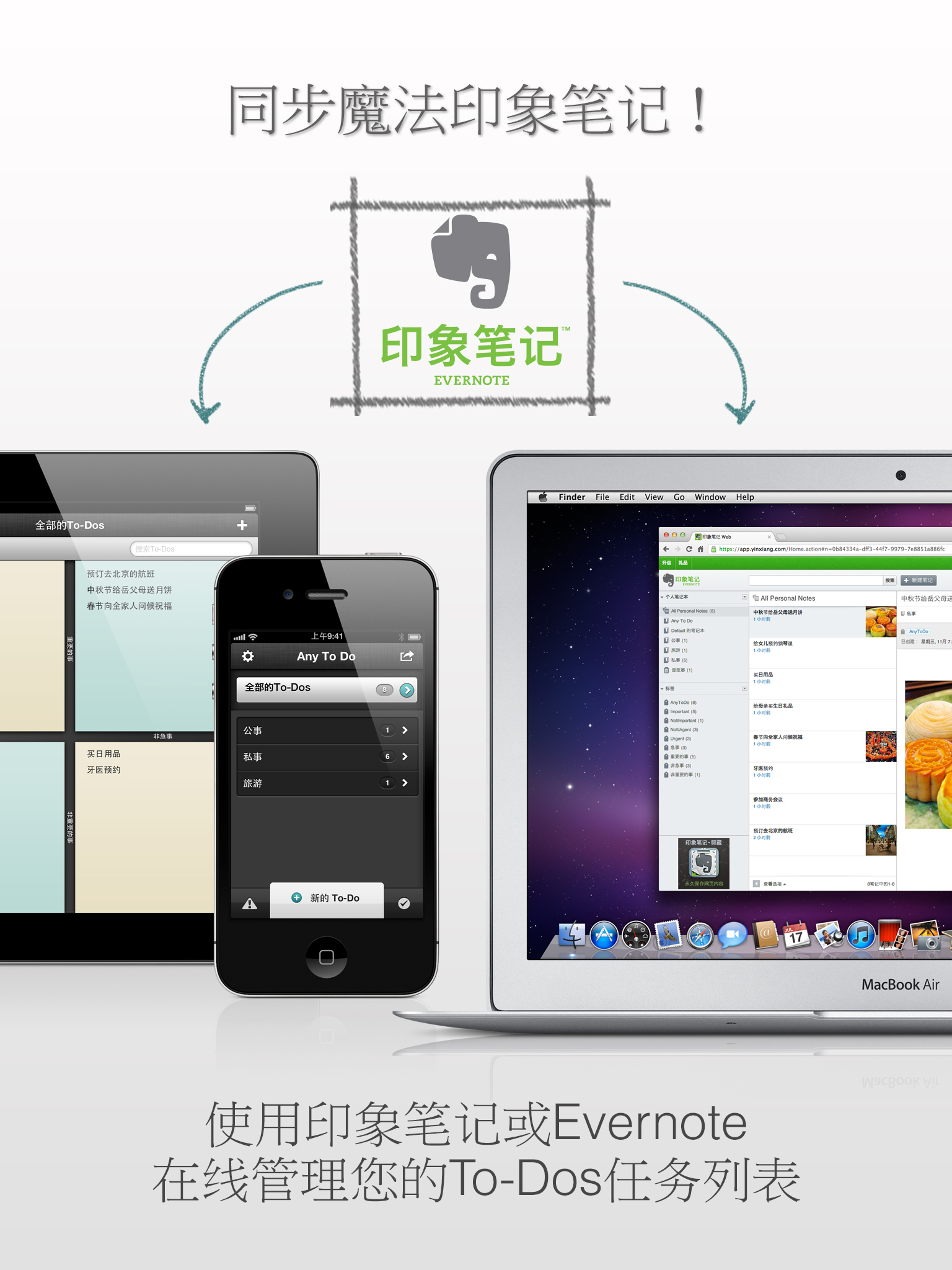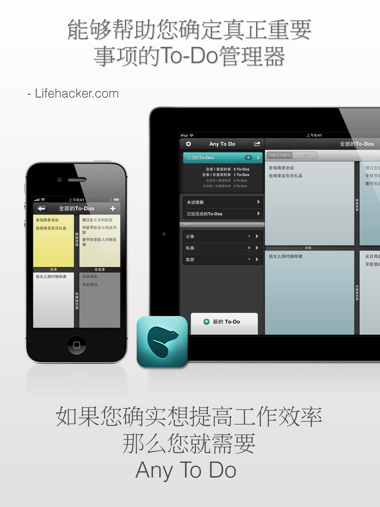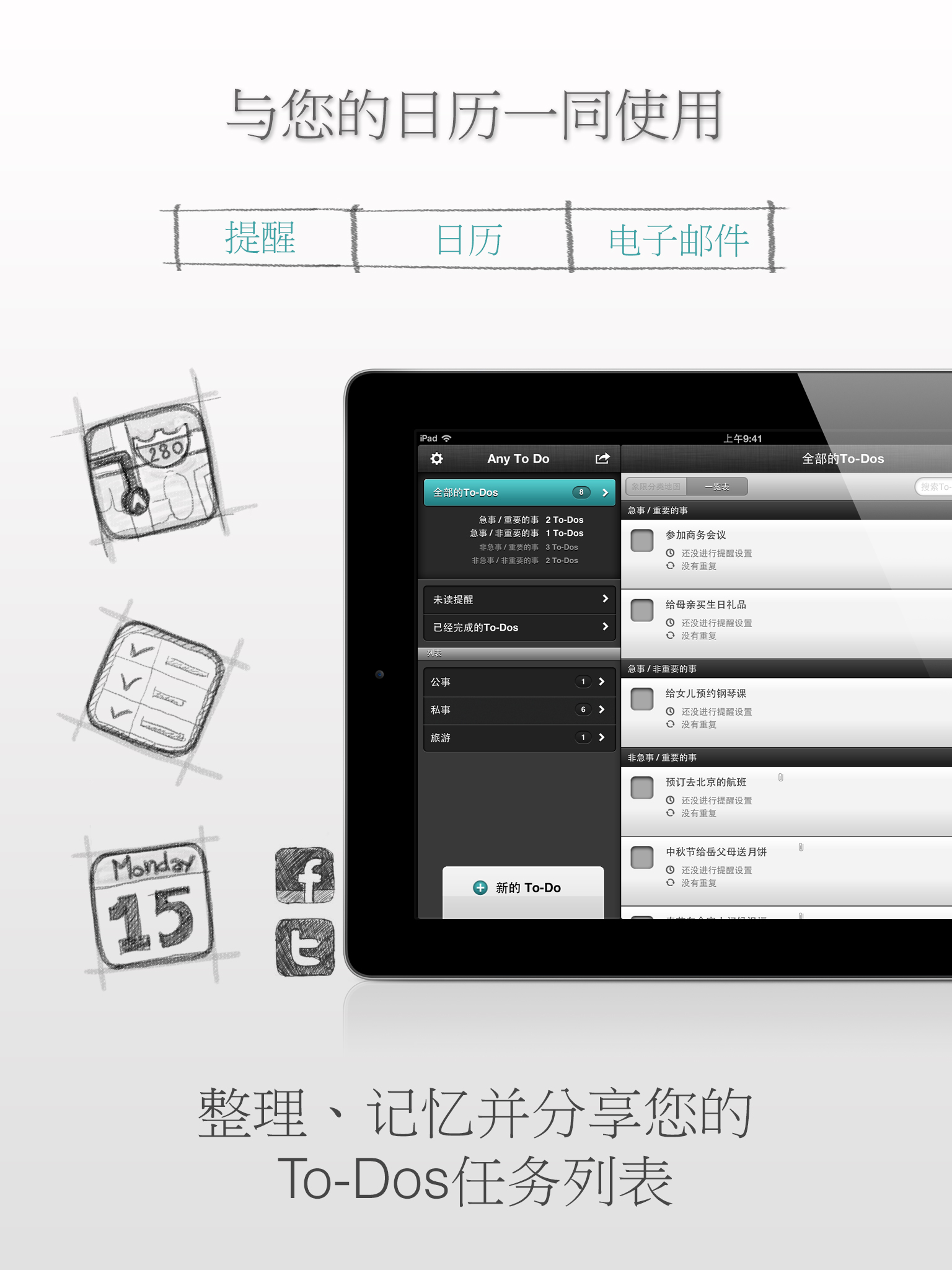 Any To Do 是一个针对iPad的To-Do(待办事项)及时间管理应用程序,能够与印象笔记(Evernote)进行无缝同步。你可以通过你的iPad以及印象笔记账户,添加、组织并管理你的To-Dos和备注笔记,这样无论你身在何处,都可以及时更新并同步你的To-Dos。