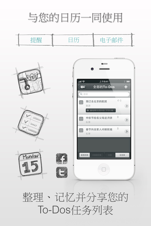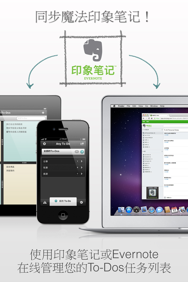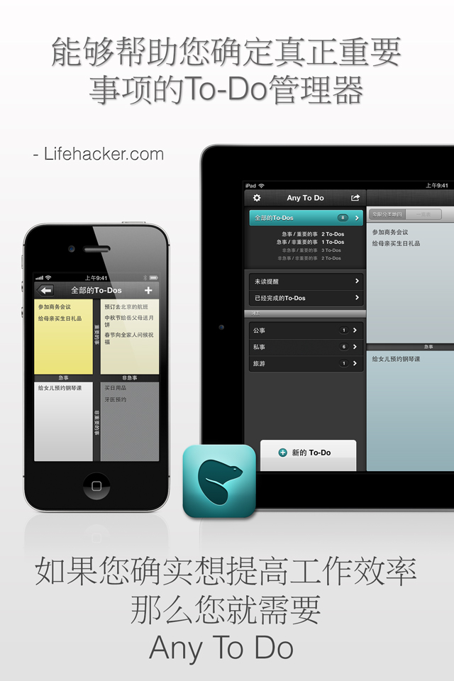 Any To Do 是一个针对iPhone的To-Do(待办事项)及时间管理应用程序,能够与印象笔记(Evernote)进行无缝同步。你可以通过你的iPhone以及印象笔记账户,添加、组织并管理你的To-Dos和备注笔记,这样无论你身在何处,都可以及时更新并同步你的To-Dos。